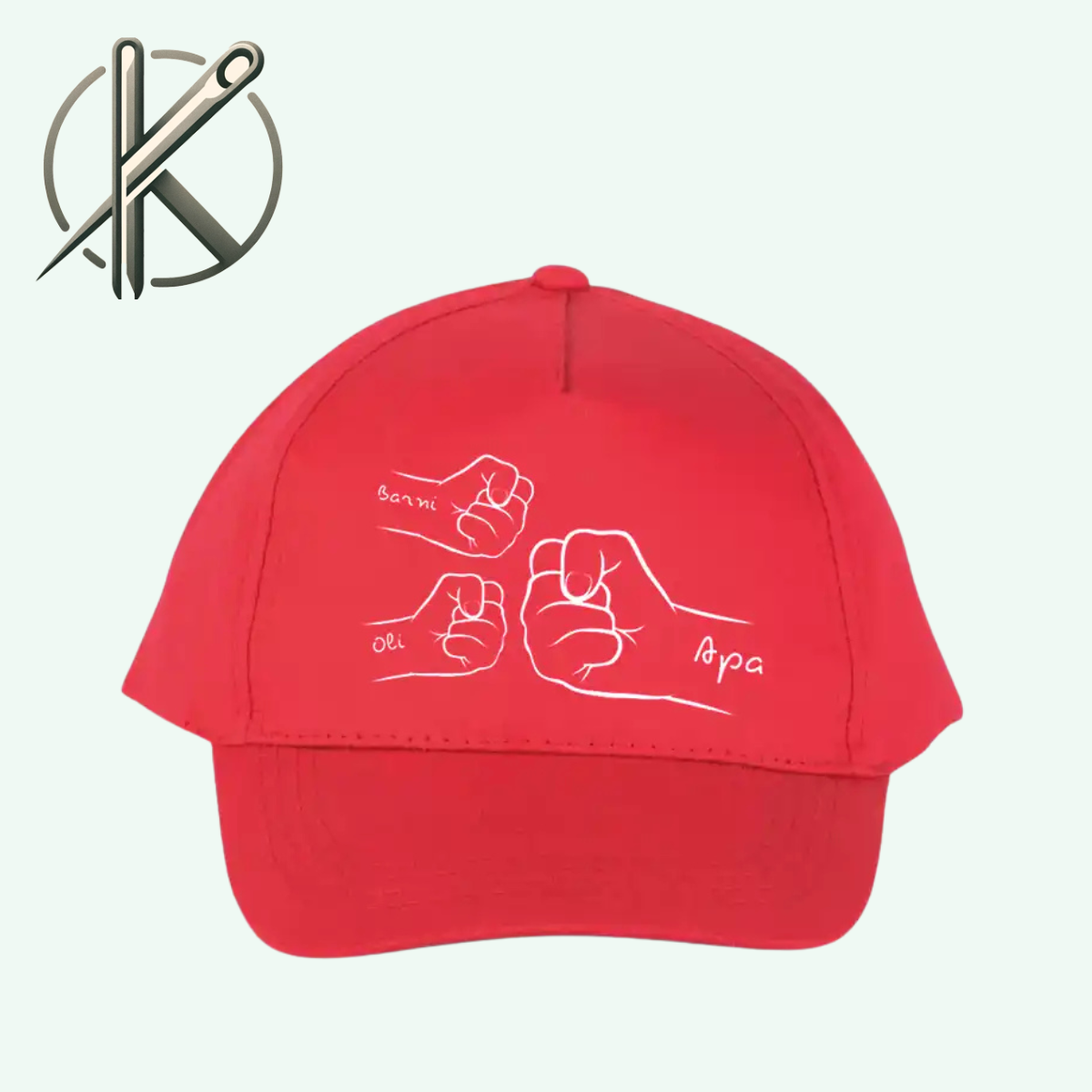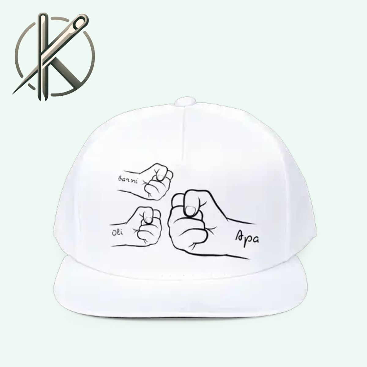 Ez az egyedi fekete baseball sapka a tökéletes választás azok számára, akik szeretik az egyszerű, de mégis stílusos megjelenést. A sapka elején egy különleges grafika látható, amely három összefonódó öklöt ábrázol, mindegyiken névvel jelenleg (Barni, Oli, Apa). A grafika fehér kontúrokkal van megrajzolva, amely kontrasztot ad a sapka fekete alapjával, így a mintázat igazán kiemelkedik és figyelemfelkeltő.