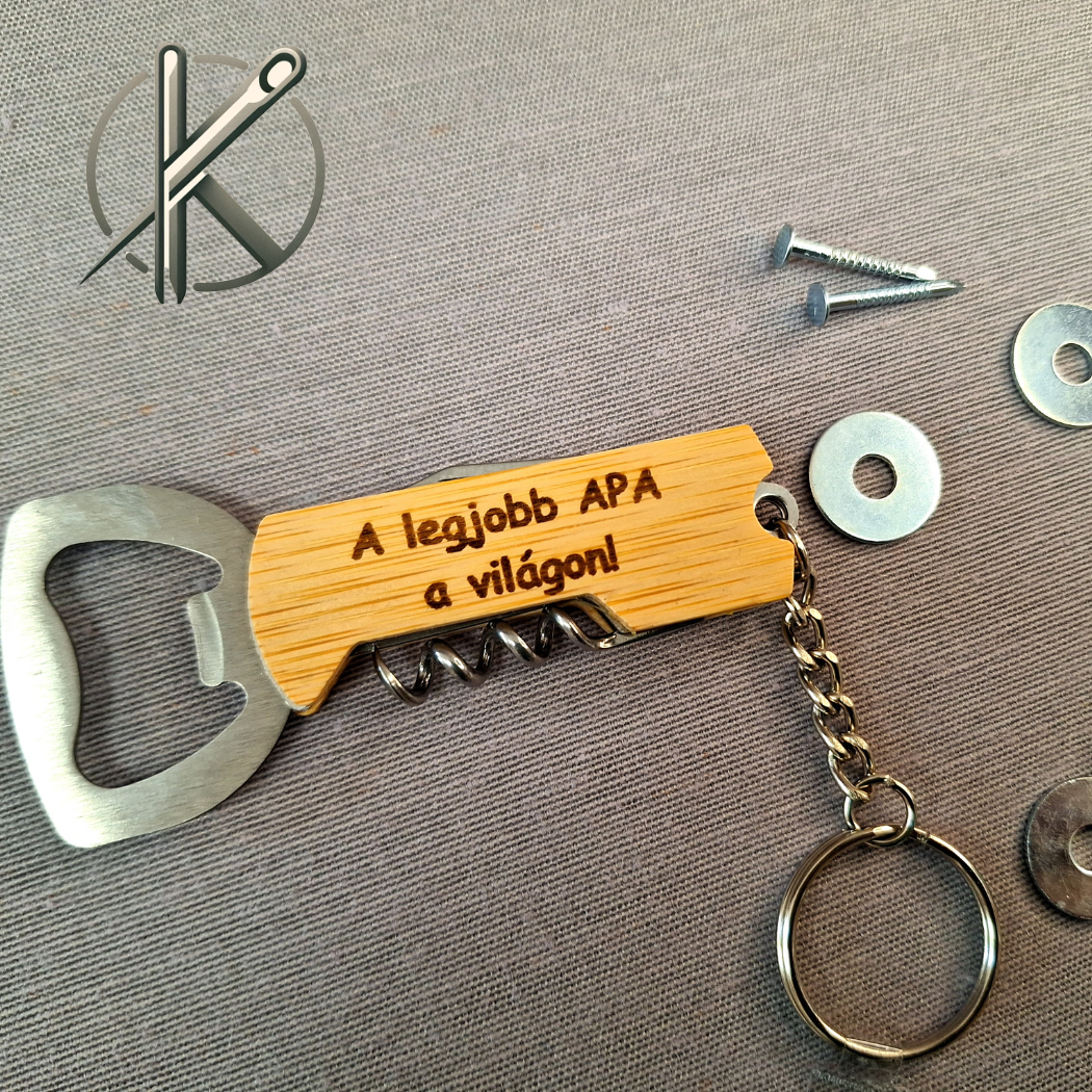 Ez a gravírozott bambusz kulcstartó beépített sörnyitót, bornyitót és bicskát tartalmaz, így mindig kéznél van, ha szükség van rá.