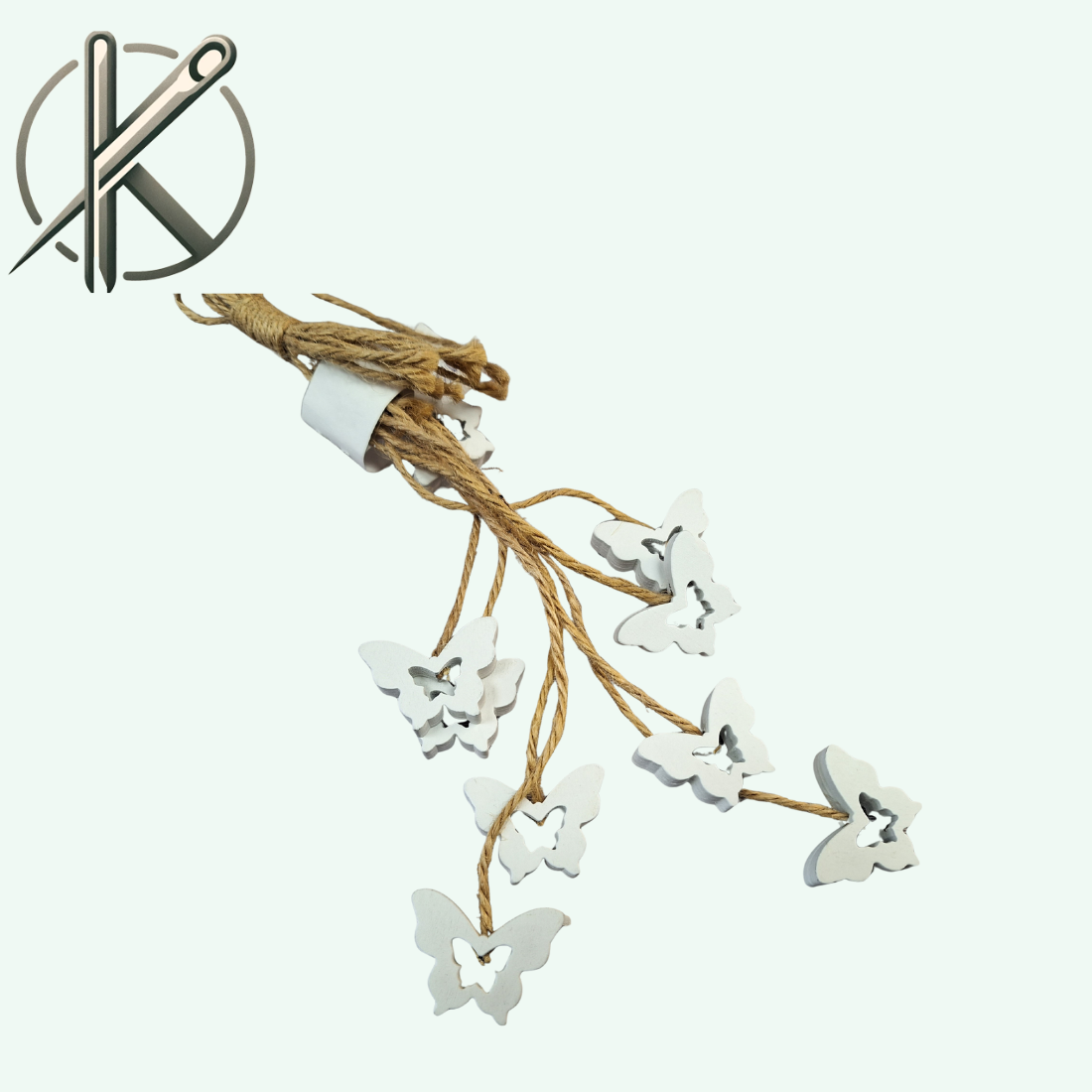Ez a juta madzagra rögzített, fehér színű fa pillangó természetes és vidám dekorációs elem, amely kiválóan illeszkedik rusztikus és természetközeli stílusú alkotásokhoz. Egyszerű, mégis látványos kiegészítő kreatív és kézműves felhasználásra.