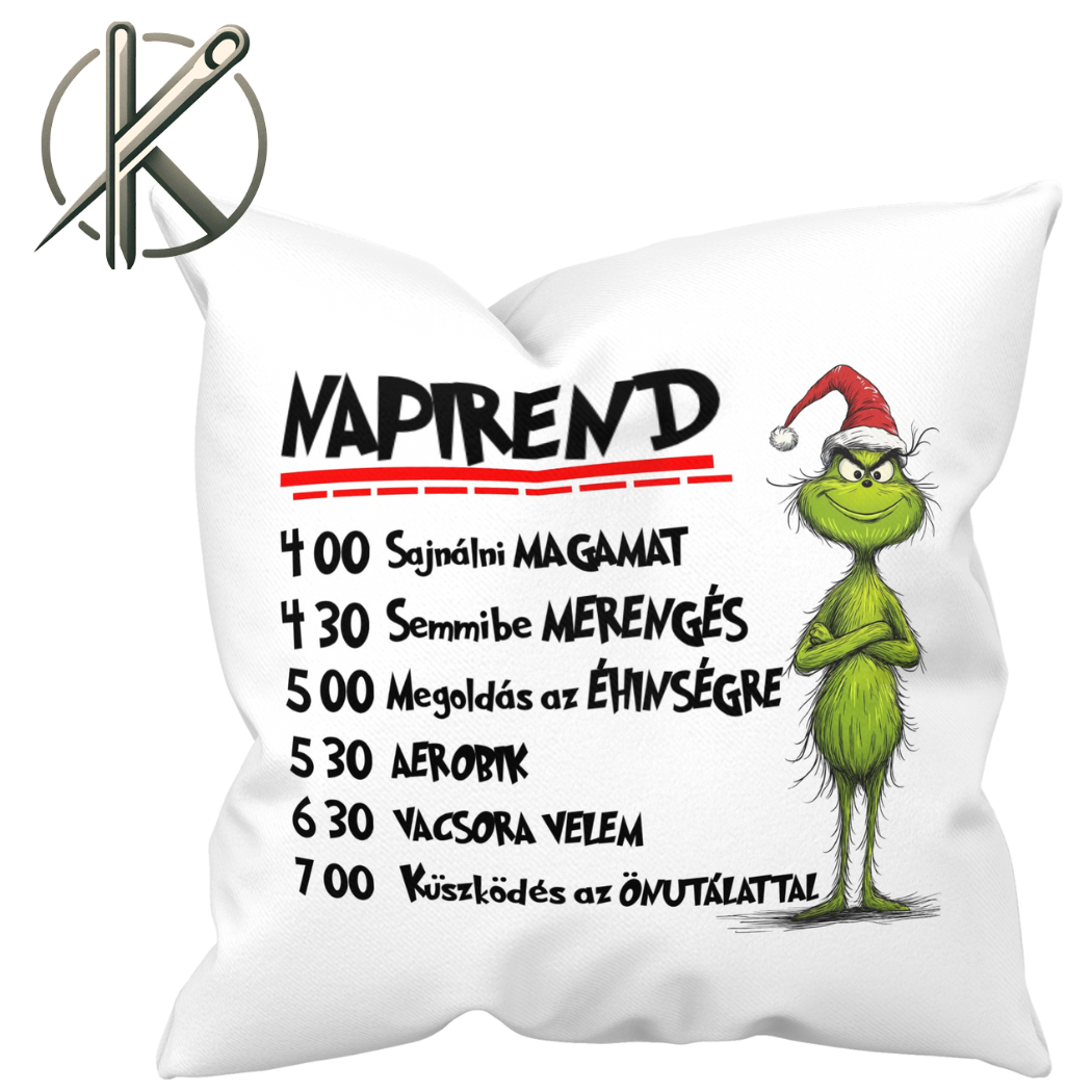 🛌 Grincs párna panel – mókás napirenddel, saját nyomtatású textilen 🕒🎄