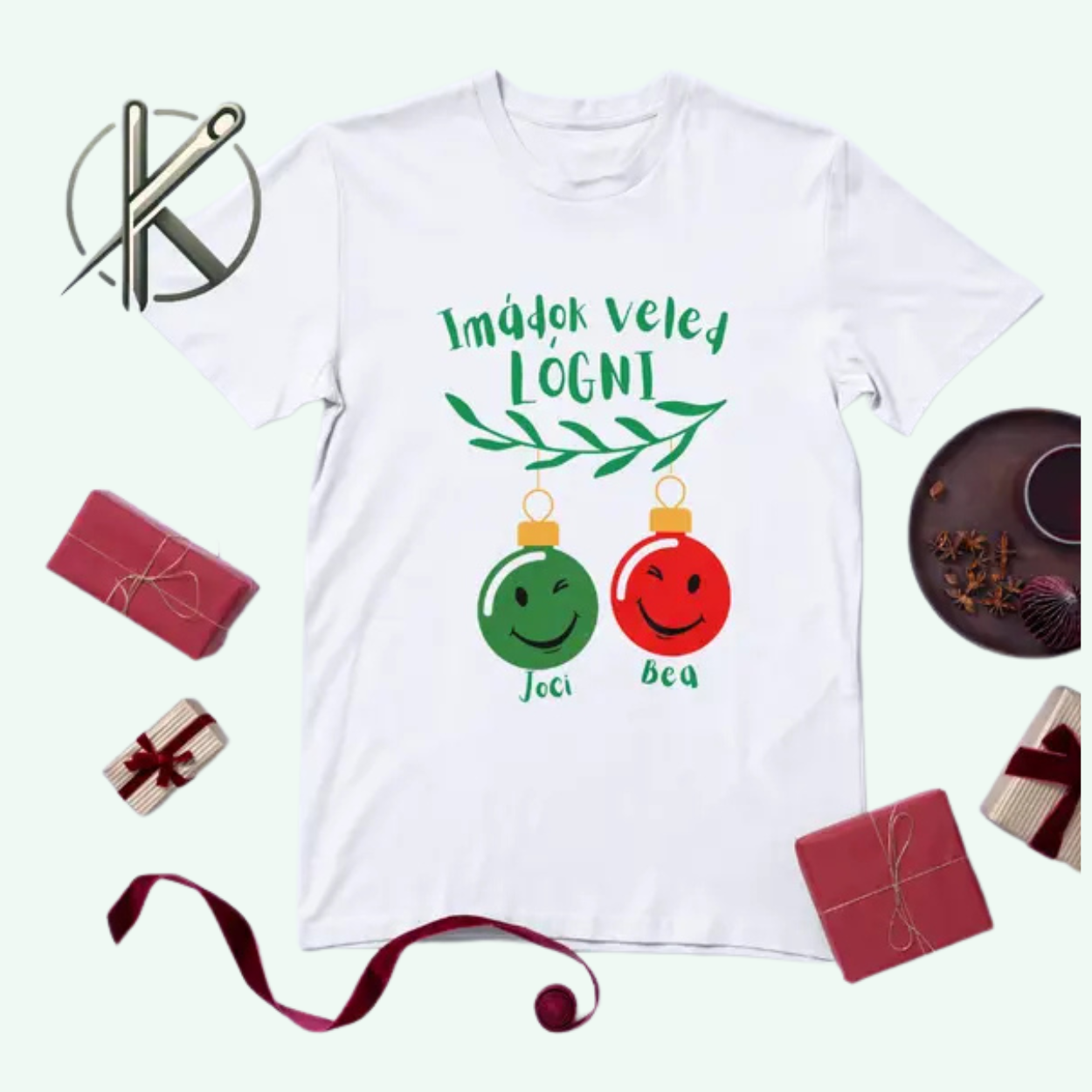 - Felirat és grafika: A pólón „imádok veled lógni” felirattal, és karácsonyi díszekkel.