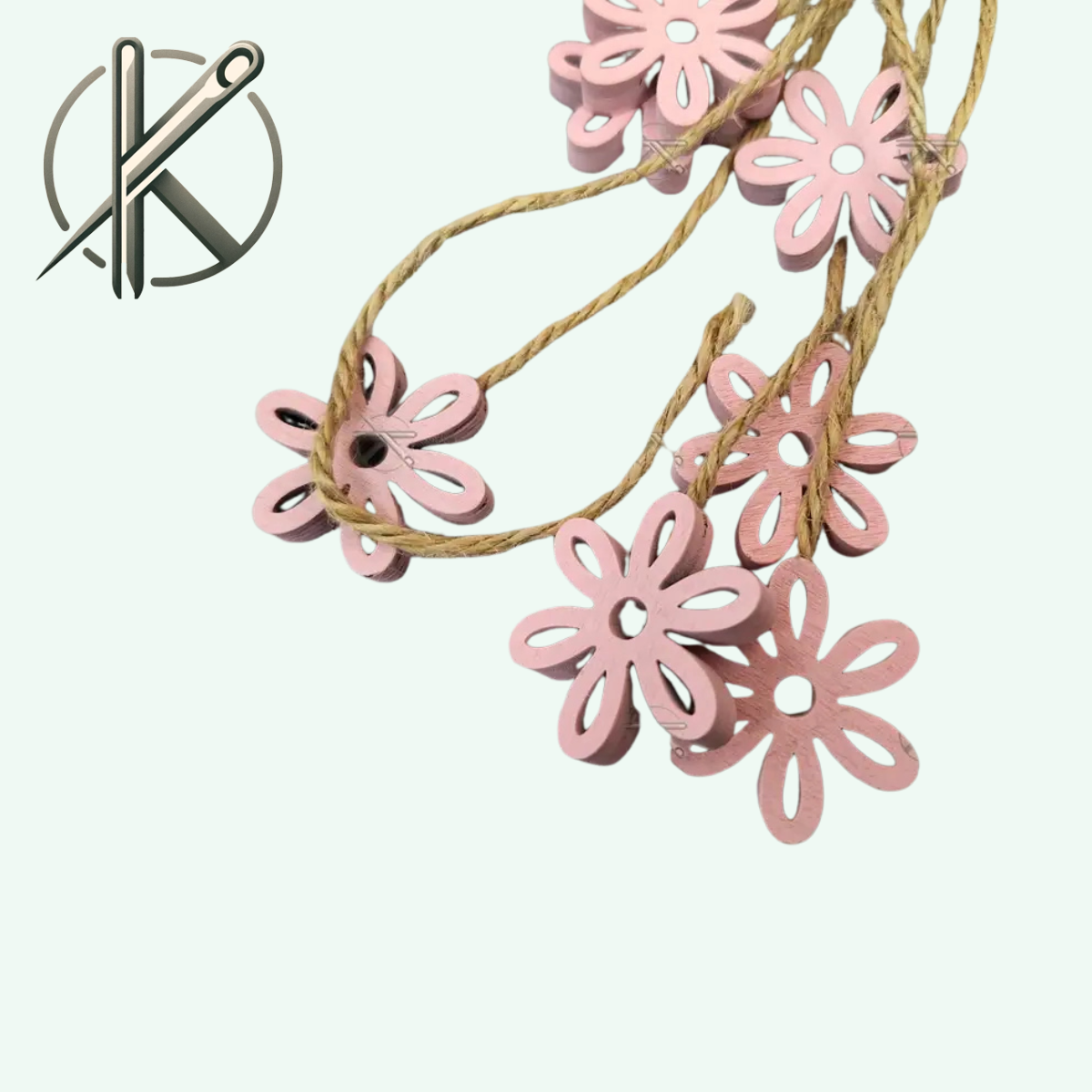 Ez a természetes hatású, juta zsinórra fűzött rózsaszín fa virág dekoratív kiegészítő, amely harmonikusan ötvözi a rusztikus alapanyagokat a finom, romantikus színvilággal. Ideális választás kreatív és lakásdekorációs felhasználásra.
